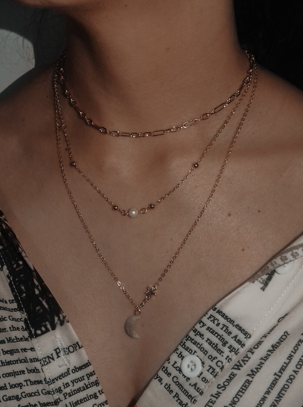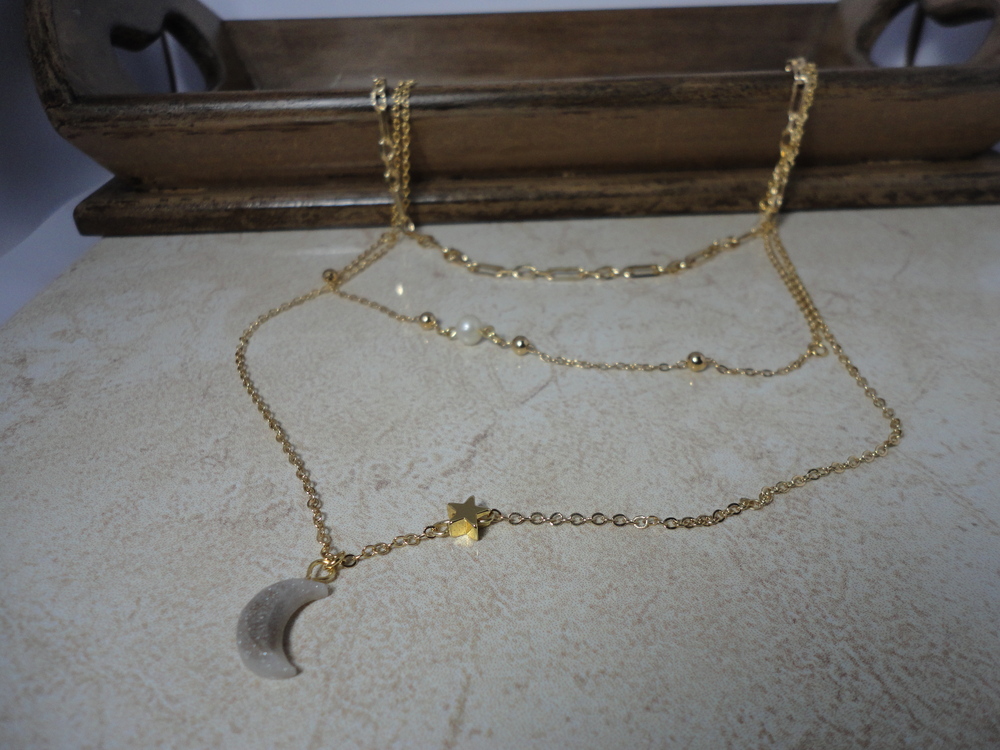 Collar triple, primero de eslabones, segundo balines y perla de río, tercero pasador estrella y dije luna con resina de cristal. Diseñadas para ti; y ya que son piezas creadas a mano las hace únicas e irrepetibles.