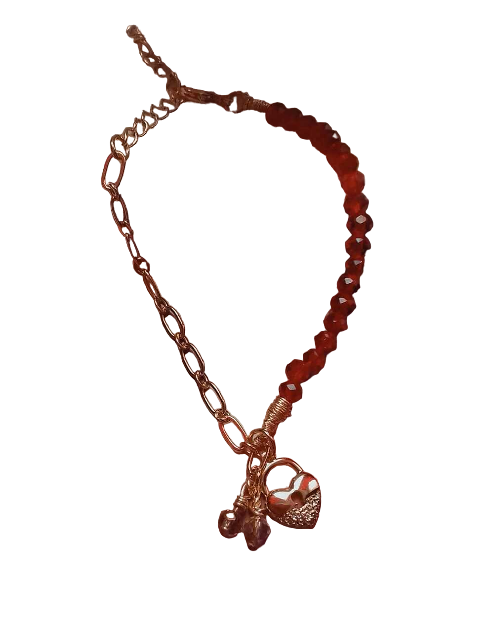 Pulsera mitad cristales y mitad cadena de eslabones, dije de corazón con micro circones y un par de cristales.  Cada vez que la uses sentirás cerca a esa persona especial.